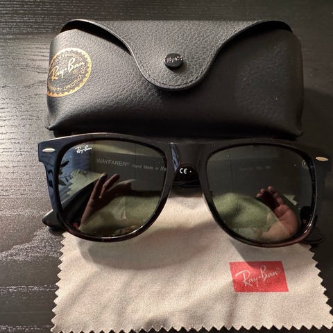 Ray-Ban Wayfarer RB2140 aurinkolasit unisex, musta kehys, koko 50-22. Valmistettu Italiassa. Mukana alkuperäinen kotelo ja puhdistusliina.