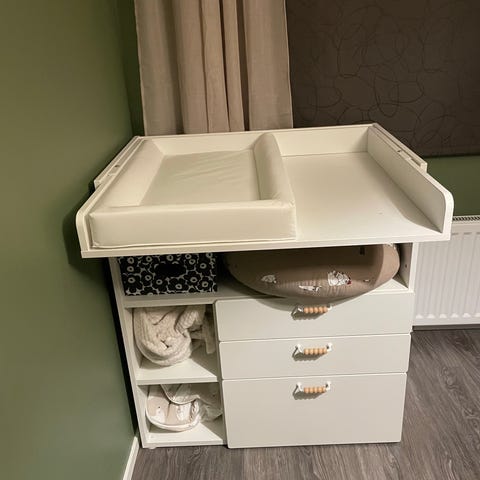 IKEA lastenhoitopöytä vaaleaa puuta, jossa pehmustettu hoitoalusta harmaalla ja valkoisella kuviolla. Sopii lastenhoitoon ja vaipanvaihtoon.