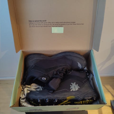 Ehjät käytetyt nastakengät talven liukkaille. Nastat tallella. Toimitus onnistuu ostajan kustannuksella. Koiratalous.