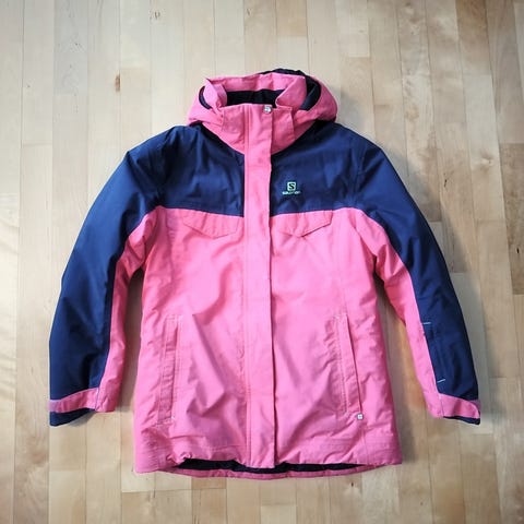 Erinomaisessa kunnossa oleva laadukas vedenpitävä Salomon laskettelutakki, joka ollut 12v 160 cm tytöllä vähäisesti käytössä. Hinta uutena oli 250-300 €. Koko naisten M, mutta Salomonilla hyvin pienet koot joten vastaa lasten kokoa 158. Viimeisessä kuvassa vertailuna Reiman poikien takki koko 152. Lumilukot hihoissa ja helmassa. Tuuletusaukot hihoissa. Vetoketjulliset taskut, myös sisätasku, sekä hissilipulle tasku hihassa. Irrotettava, säädettävä huppu, pehmustettu kaulus.