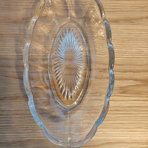 Riihimäen lasin sillivati, leveys 10 cm, pituus 22 cm ja korkeus n 3 cm.