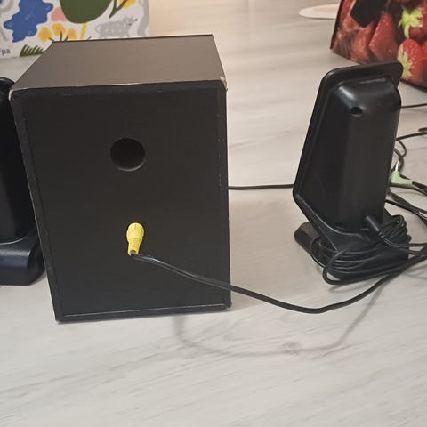 Vanhat, mutta ihan siistit ja toimivat kaiuttimet, jotka olivat joskus mulla tietokonekaiuttimina. Näitä voi käyttää 3,5mm ulostuloliitännällä varustetuissa laitteissa. Käytönjälkiä on, katso kuvat, niistä kunto selviää, luonnehtisin hyväksi, verkot ehjät. Kivaa näissä oli se että bassoa pysty säätää nupista ja ei nää niin rumatkaan ollut.