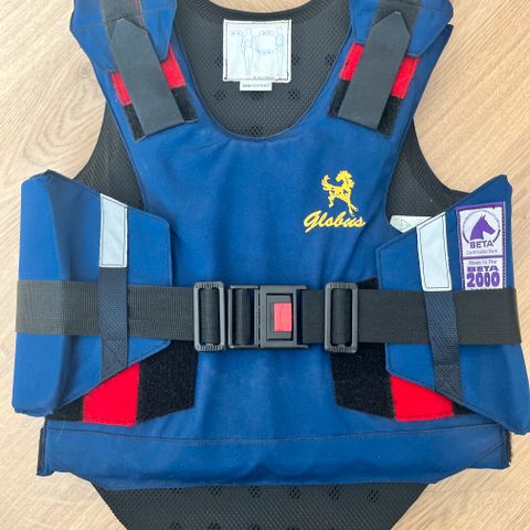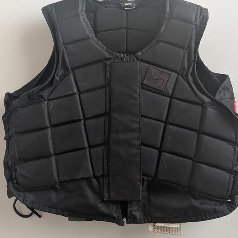 Turvaliivi ratsastukseen. Koko XL (lapsen koko). Sopii lapselle tai pienikokoiselle aikuiselle. Kohtalaisen hyvässä kunnossa. Vasemmalta puolen säätöremmi rikki, varmaankin ommeltavissa.