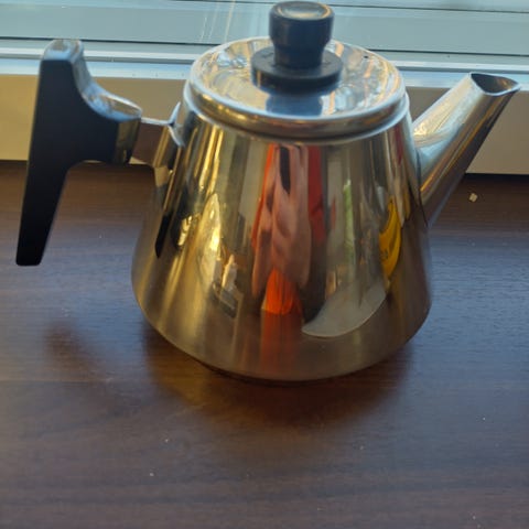 Kuvien vanhempi teräksinen kahvipannu.