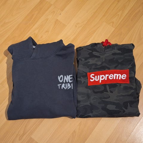 Tyylikäs tummansininen Supreme-huppari, kokolapussa lukee XL, mutta arvioisin olevan 146cm kokoinen.
