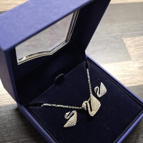 Hyväkuntoinen ja vähän käytetty tyylikäs kaulakoru ja korvakorut. Kaulaketjun pituus 36cm + jatko n. 5cm