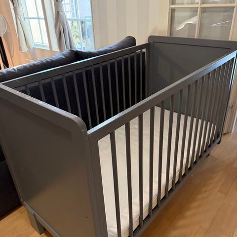 JLY Pinnasänky oikein hyvässä kunnossa ja melko vähällä käytöllä ollut ylipäänsä. Ihan pientä naarmua laidassa. Laidan saa laskettua. Patja Ikean Vyssa, jonka kanssa käytetty aina pisusuojaa ja petaria. Petareita 2 kpl saa mukaan. Kokoamisohjeen saa myös mukaan.