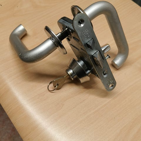 Hyväkuntoinen riippulukko neljällä avaimella.