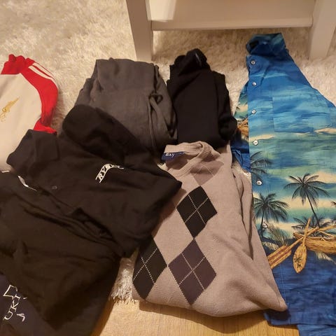 Annetaan kaksi tummansinistä t-paitaa koossa M. Toinen on Dressmann ja toinen Michel. Housut kokoa L32 W32 Petrifun. Niissä lahkeet kuluneet.
