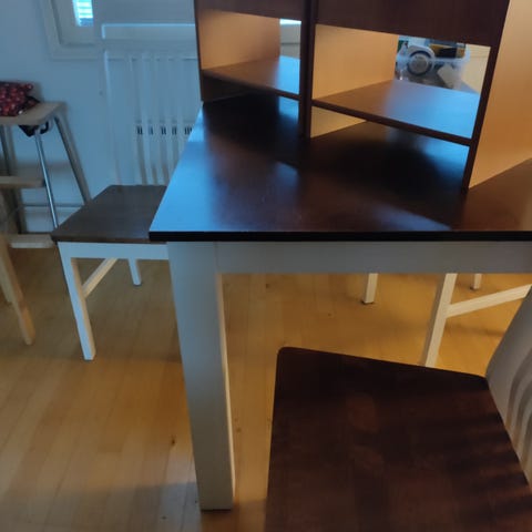 Annetaan vanha ja kärsinyt ruokapöytä. Pinnassa paljonkin sanomista, yhdessä kohtaa näyttää olevan myös naula kannesta läpi. Jalat kaipaa kiristystä.