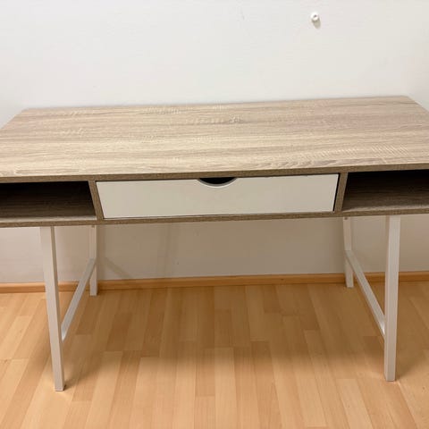 Ikean työpöytä, petroolin värinen pöytälevy, valkoiset putkijalat. Ollut käytössä n. vuoden. Hyvä kunto.