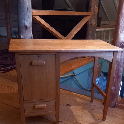 Kokonaan kunnostettu Billnäs-kirjoituspöytä. Alkuperäiset osat lukuunottamatta laatikoiden sivuja ja takaosaa, jotka valmistettu myöhemmin. Tyyppikilpi tallessa. Tammensävyinen vaha. Hyväkuntoinen ja ehjä.