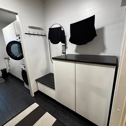 Alhaalla yksi 80cm leveä kaappi ja 2 laatikostoa. Ylin pieni laatikko silityslauta.