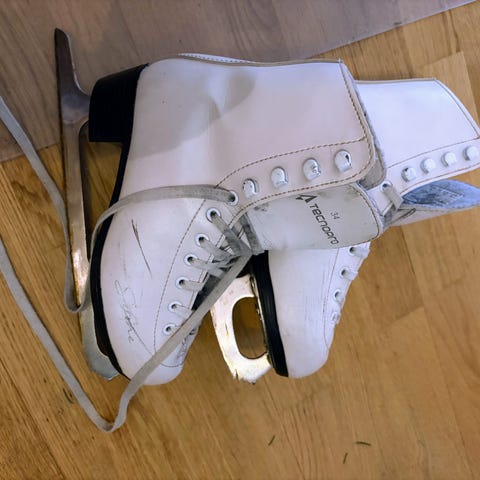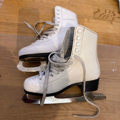 GS3 lasten luistimet koko 34, valkoinen väri. Luistimissa on perinteinen nauhoitus ja ne on valmistettu keinomateriaalista. Pohjan sisämitta n. 22 - 22,5 cm. Vasemman luistimen sisäsyrjässä tahra (näkyy kuvassa), muuten siistit ja vähän käytetyt. Punaiset suojat kuuluu pakettiin.