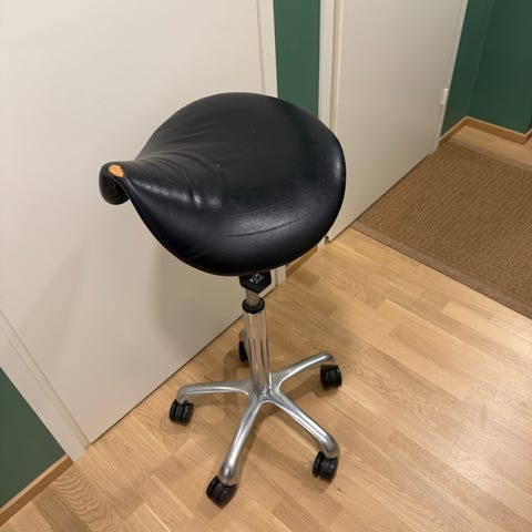 Myydään kuvan satulatuoli. Tuoli osuus ehjä ja hyvässä kunnossa, mutta pumppu on rikki/ei toimi niin ei nouse ylemmäksi. Viimeisessä kuvassa mitta mihin jää.