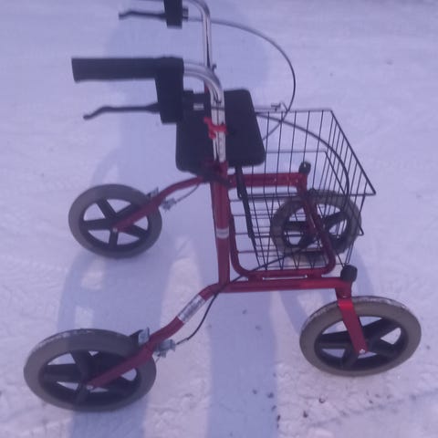 Punainen rollaattori, jossa neljä pyörää, istuin ja etukori. Rollaattori on tarkoitettu tukemaan liikkumista ja tarjoaa istumapaikan taukoja varten. Varustettu kahvoilla ja jarruilla. Sopii sisä- ja ulkokäyttöön.