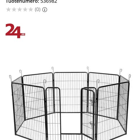 Suositellaan keskikokoisille pennuille ja keskikokoisille aikuisille koirille. Sopii ulko- sekä sisätiloihin. Helppo asentaa, ei tarvita työkaluja. Vie koottuna vähän tilaa. 8 toisiinsa kiinnitettävää paneelia, yhden paneelin koko 61×91 cm. Kaikki osat tallella.