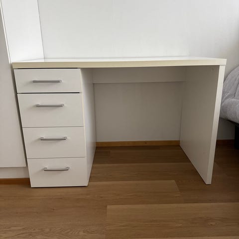 Myydään Ikean valkoinen korkeakiiltoinen työpöytä kahdella vetolaatikolla.