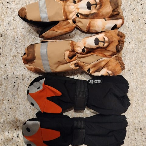 7 paria rukkasia. Paljon käytettyjä, joten kulumaa löytyy ja eivät ole enää niin lämpimiä kuin uutena. Kaksissa parissa enemmän kulumaa, jopa reikiä. N. 3-4-vuotiailla olleita.