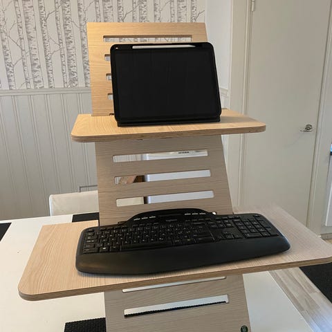 Ergonominen työtaso sopii tavalliselle pöydälle. Koivuvaneria, harmaa antrasiitti-väri. Kätevä korkeuden säätö: 13 korkeutta, tason kantokyky 8 kg. Vakaa ja tukeva. Helppo koota neljästä osasta, käytön jälkeen helppo purkaa pois ja säilyttää vaikka kaapissa. Kotimaista koivuvaneria. Käytetty muutaman kerran. Uutena hinta 160 e, nyt vain 60 e! Nouto Hyvinkäältä.