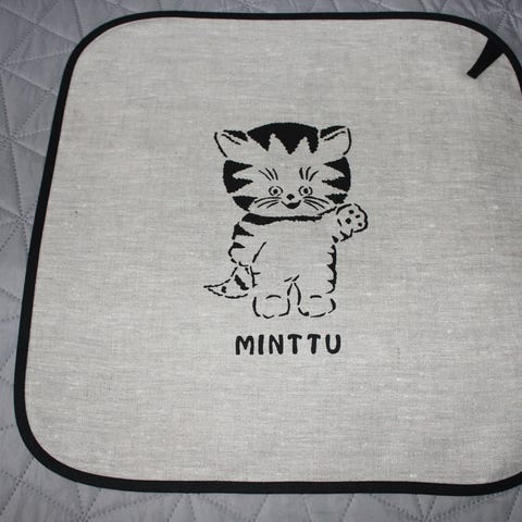 Uusi pellavasta ommeltu laudeliina/pefletti noin 45x45cm, johon käsinpainettu Chihuahua kuva.