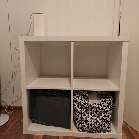 Ostan kohtalaisessa kunnossa olevan valkoisen kallax hyllyn eli kokoa 77cm x 77 cm eli kuution mallisen tuotuna kankaantaakse