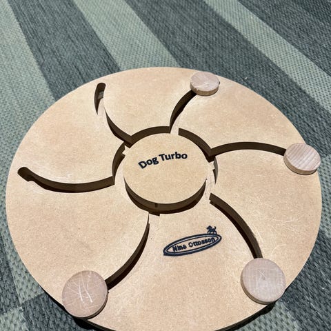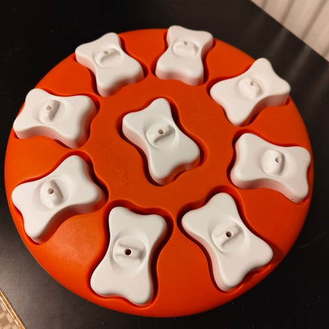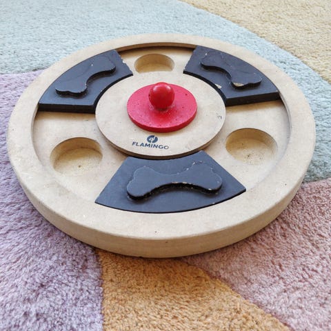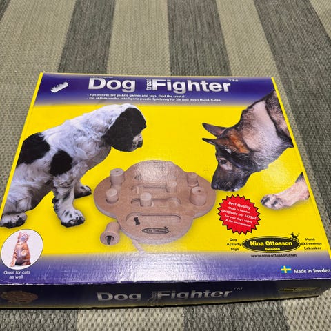 Myydään Nina Ottosson koiran älypeli, Dog casino. Mustat osat muovia, muuten puinen. Yhtä mustaa tulppaa pureskeltu (kts. kuva), mutta toimii silti normaalisti.