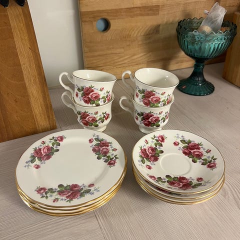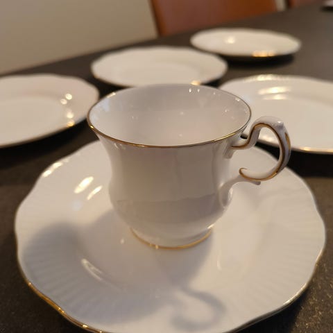 Myydään 12hlö Queen Anne posliiniastiasto. 12kpl kuppeja, 12 kpl tasseka ja 12kpl lautasta. Mukana kermakko ja sokerikippo. Kultakoristeiset reunat.