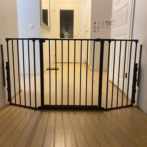 Toimiva koira/lapsiportti. Leveyttä voi säätää jonkin verran. Meillä ollut 81cm lev. oviaukossa.