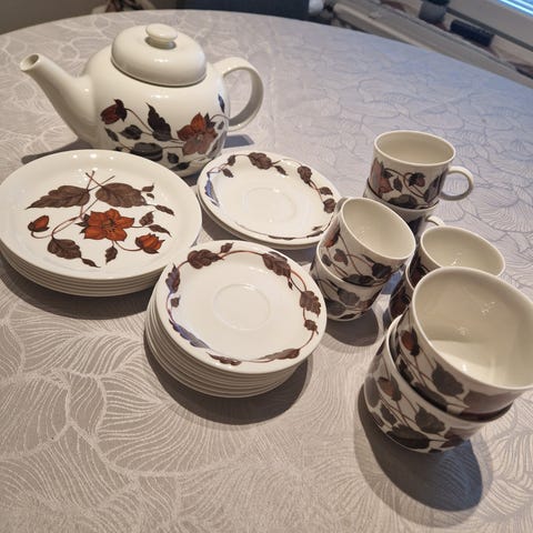 Arabia kahviastiasto, jossa on ruskeat kukka- ja lehtikuvioinnit. Astiastoon kuuluu teekannu, sokerikko, kermakko, kahvikuppeja ja lautasia. Materiaali posliinia.Käyttämättömät.