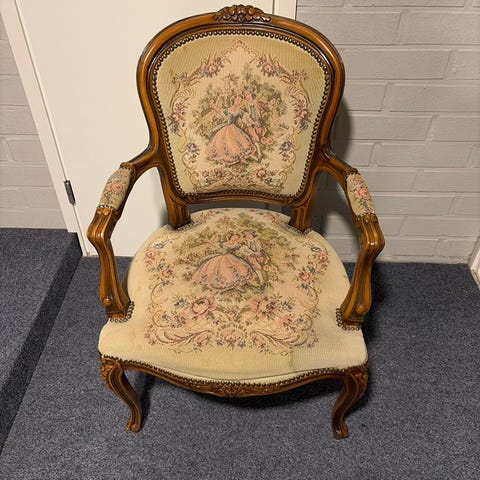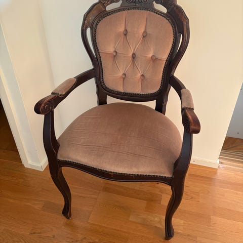 Vaaleanruskea, plyysiverhoiltu, antiikkinojatuoli. Istuinosan verhoilu hieman nuhruinen, mutta ehjä.