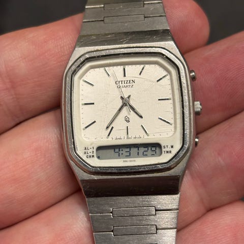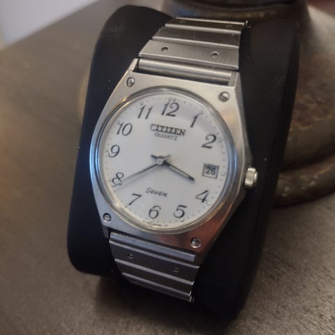 Myydään erittäin siistissä kunnossa oleva Citizen seven TV 80-luvulta. Ranneke ja kuoret ovat erittäin siistissö kunnossa. Kultaus on pysynyt hyvin paikallaan, eikä kellossa ole juurikaan naarmuja. Taulu sekä lasi ovat myös hyvässä kunnossa. Takakannessa muutama jälki, jotka näkyvät kuvissa.