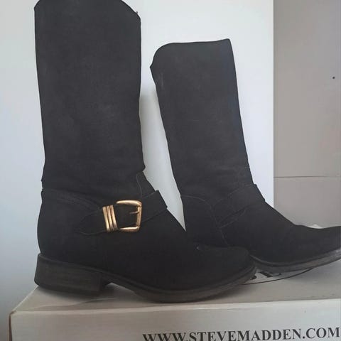 Nahkaiset Steve Madden saappaat. Vähän käytetyt. Toisessa korossa osumasta jäänyt jälki. Väri on mustanruskea.