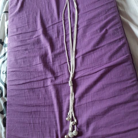 Myynnissä kaulakoru, kaulahihnan pituus noin 60 cm. Riipuksen korkeus 6 cm ja leveys 4 cm.