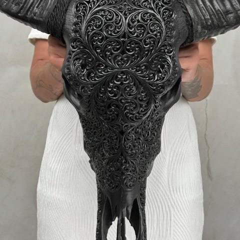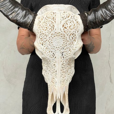 Suuri vesipuhveli-kallo, joka on kaiverrettu käsin lahjakkaan balilaisen käsityöläisen toimesta. Heidän isänsä ovat siirtäneet ikivanhan kaiverrustaidon pojilleen. Tämä kallo on täysin avattu kaiverruksella. Kaiverrus on poikkeuksellisen korkealaatuista.