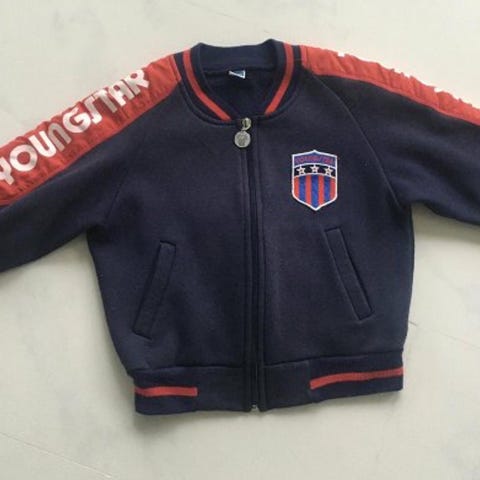 Ehjä lasten keltainen collegetakki. Edessä on pari tahraa. Merkki: Astor Junior. Koko: 116.