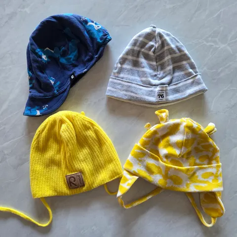 Reiman toppahanskat, koko 0, väri musta, sivussa vetoketjut, kunto hyvä, vähällä käytöllä ollut. Gugguun tupsupipo, M, väri musta, ehjä, tupsut ei enää ole uudenveroiset pöyheät. Mini rodinin ohuempi myssy koko 44-46, t.sin, kunto hyvä. Jonathanin musta puuvillakypärämyssy, koko 50. Tätä käytetty paljon mutta menee vielä seuraavalle.