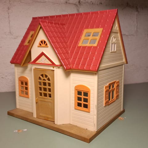Sylvanian Families leikkimökki, jossa on punainen katto. Leikkimökissä on parveke ja riippumatto, ja se sopii lasten leikkeihin. Aitapaloja puuttuu.