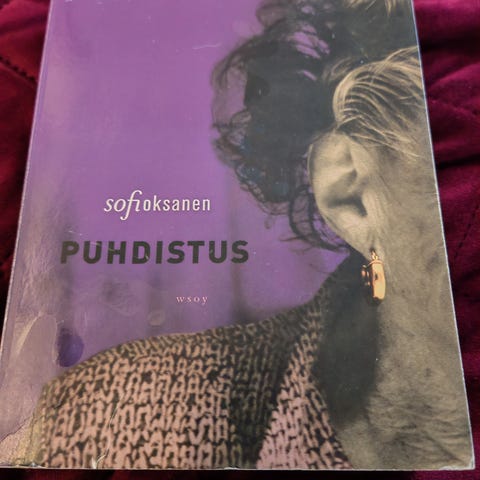 Sofi Oksanen Puhdistus kirja. Kirja on suomenkielinen ja sisältää romaanin. Kansien väri on violetti ja se on pehmeäkantinen.