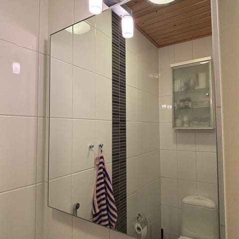 Lasinen pöytäpeili, jossa on tukeva jalusta. Myydään pois remontin alta. Ollut kylpyhuoneen peilinä. Leveys 68cm, korkeus 65 cm. Nopea Nouto Nummela