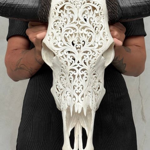 Suuri vesipuhveli-kallo, joka on kaiverrettu käsin lahjakkaiden balilaismestareiden toimesta. Heidän isänsä ovat siirtäneet ikivanhan kaiverrustaidon pojilleen. Tämä kallo on täysin avattu kaiverruksella. Kaiverrus on poikkeuksellisen korkealaatuista.
