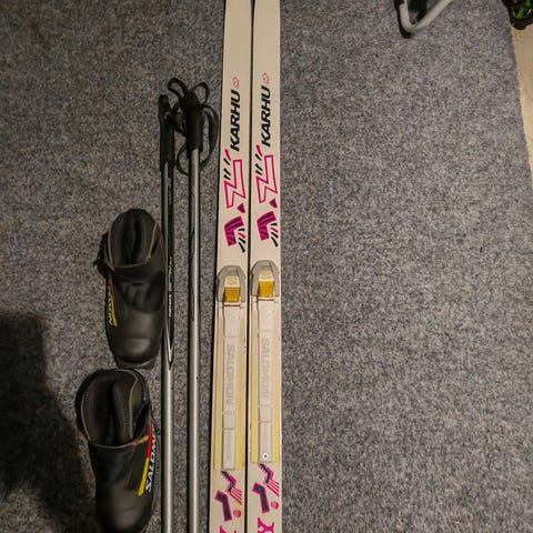 Karhun sukset rofellan siteillä 140cm, sauvat 100cm, monot snow storm 34. Hyvä käytetty kunto. Toisen suksen takana liimattu pieni kohta ekan käyttäjän toimesta, ei vaikuta käyttöön.