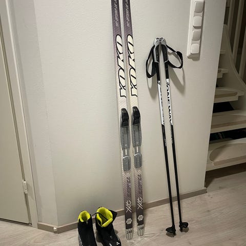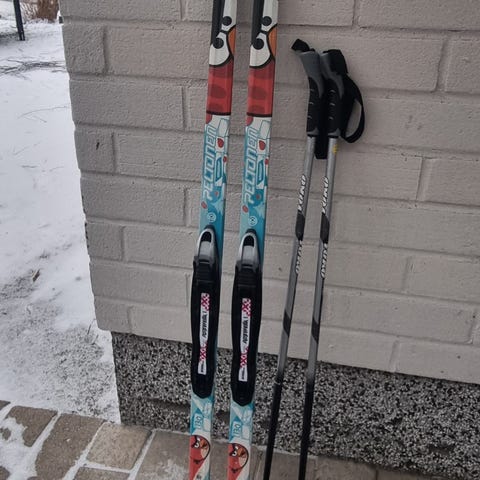 sukset 140cm, monot 34, sauvat 100cm