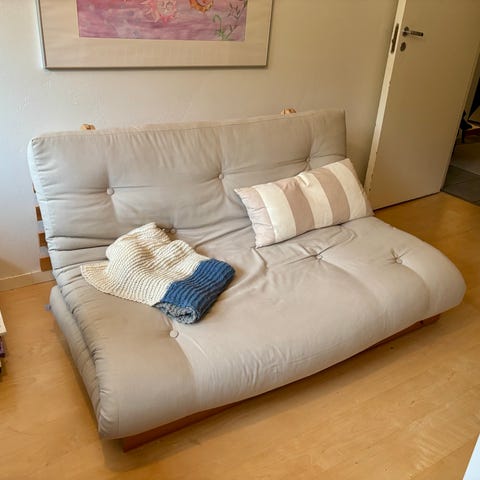 Myydään muuton vuoksi pari vuotta vanha Roots futon-sohva. Musta runko, patjan väri pellava. Ollut vierashuoneessa, joten vähällä käytöllä. Peitetty aina kuvassa näkyvällä valkoisella patjansuojuksella (saa kaupan päälle) tai kuvan peitolla. Patja moitteeton (ei tahroja, napit tallella) ja runko ehjä ja naarmuton. Savuton talous eikä lemmikkejä. Ollut vain uudessa kerrostaloasunnossa, jossa ei sisäilma- tai tuholaisongelmia. Nouto Pohjois-Tapiolasta.