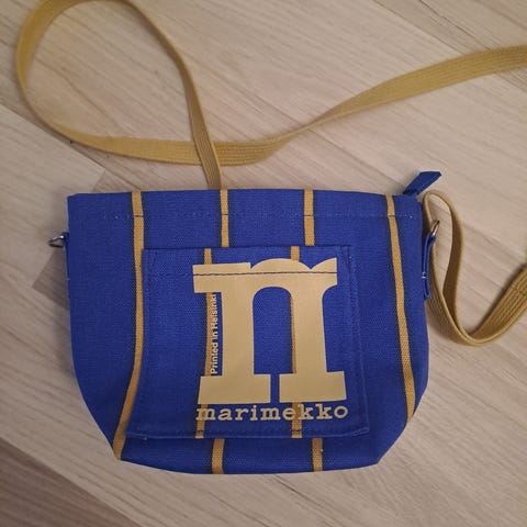 Marimekon kankainen musta olkalaukku, suunniteltu unisex-käyttöön. Laukussa on säädettävä olkahihna ja useita vetoketjullisia taskuja. Materiaali on kestävä kangas, joka sopii arkipäivän käyttöön.