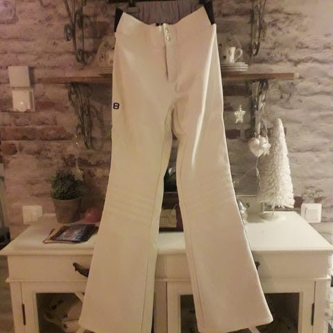 Mustat lasketteluhousut, lahkeissa lumilukot. Leveys lantion kohdalla 49 cm, pituus haarasta 80 cm. Kokolappua ei ole,