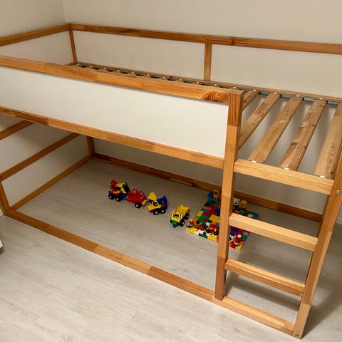 Myynnissä on IKEA Kura parvisänky. Parvisängyssä on punainen runko ja Salama Mcqueen koriste paneelissa. Sängyn rungossa on tikkaat ja alapuolella säilytystilaa. Sopii lasten huoneeseen. Tässä on alkuperäinen malli: https://www.ikea.com/fi/fi/p/kura-kaeaennettaevae-saenky-valkoinen-maenty-80253809/