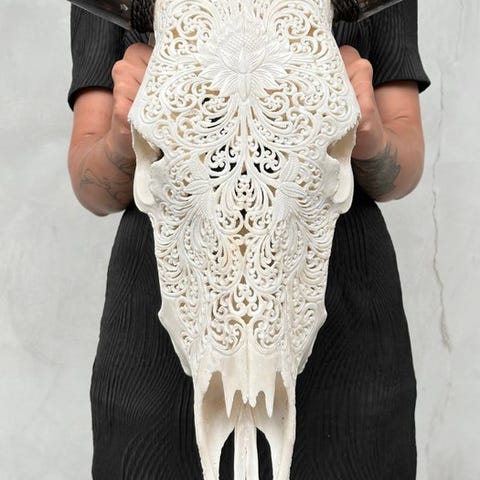 Suuri käsin kaiverrettu härän kallo, jonka ovat kaivertaneet taiteilijat, jotka ovat siirtäneet muinaisen kaiverrustaidon isältä pojalle. Kallo on täysin käsin veistetty suurella huolella. Se on epätavallinen, koristeellinen kappale.