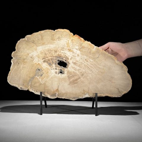 Upea kivettyneen puun viipale räätälöidyllä jalustalla.