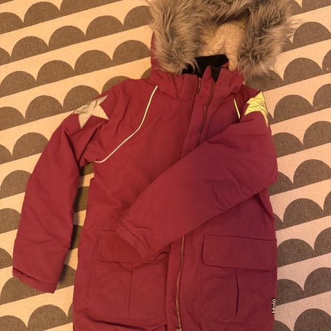 Molon Cathy talvitakki koossa 140. Takki on hyvässä käytetyssä kunnossa vielä seuraavalle. Isoin moite on takaa helmasta irronnut tähtiheijastin. Muutoin takissa on hieman pehmentymää ja kulumaa, mutta kirjavan kuosin ansiosta ei kuitenkaan silmiinpistävästi. Takkia voi tulla halutessa myös sovittamaan.